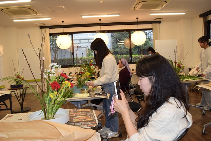 冬の華道教室を開きました 華道の歴史について先生に教えてもらいます。 それから先生のお手本をまねて、自分でお花をいけます。 お花の形は全部違うので、仕上がった作品も みんな違います。 それぞれの個性が光る素敵な作品ができましたね!