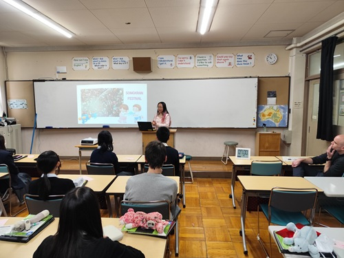 大阪府立芥川高等学校の授業に、本校の留学生を派遣し、高校生との英語を使った国際交流講座を実施しました。 まず、留学生から自分の国について紹介してもらったあと、グループごとに分かれて高校生から留学生に質問する時間を設けました。 どのグループも大変盛り上がり、交代の時間が来るたびに「もう終わってしまった」と溜息が聞こえるほどでした。 授業が終わっても、休憩時間には多くの高校生が留学生に質問したり話しかけたりしており、留学生も楽しそうに応じていました。帰り際には、教室から見送っていただき、留学生からも「また機会があれば、こうした交流にぜひ参加したい」と笑顔で話してくれました。 今回の交流を通して、高校生も留学生も、言語を通じてのコミュニケーションの楽しさやお互いのことをわかりあえる重要さを改めて感じることができたと思います。